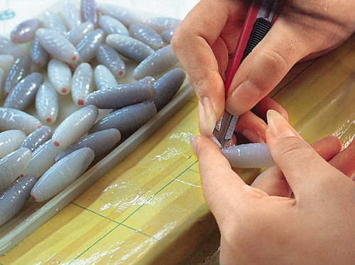 工人利用美工刀划出天珠上的纹路