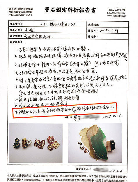 其实天珠的所谓鉴定证书我个人觉得毫无意义,因为鉴定仅仅是鉴定底料的真假、矿石品种,他是不会帮大家鉴定是何种镶蚀工艺作成的天珠,或者是否是假冒天珠的,所以我建议大家不管在买什么样的天珠,基本不需要看什么所谓的检测证书,那是毫无意义的,因为即使底料是“天然玉髓”,但镶蚀工艺不对的话,还是假冒天珠。